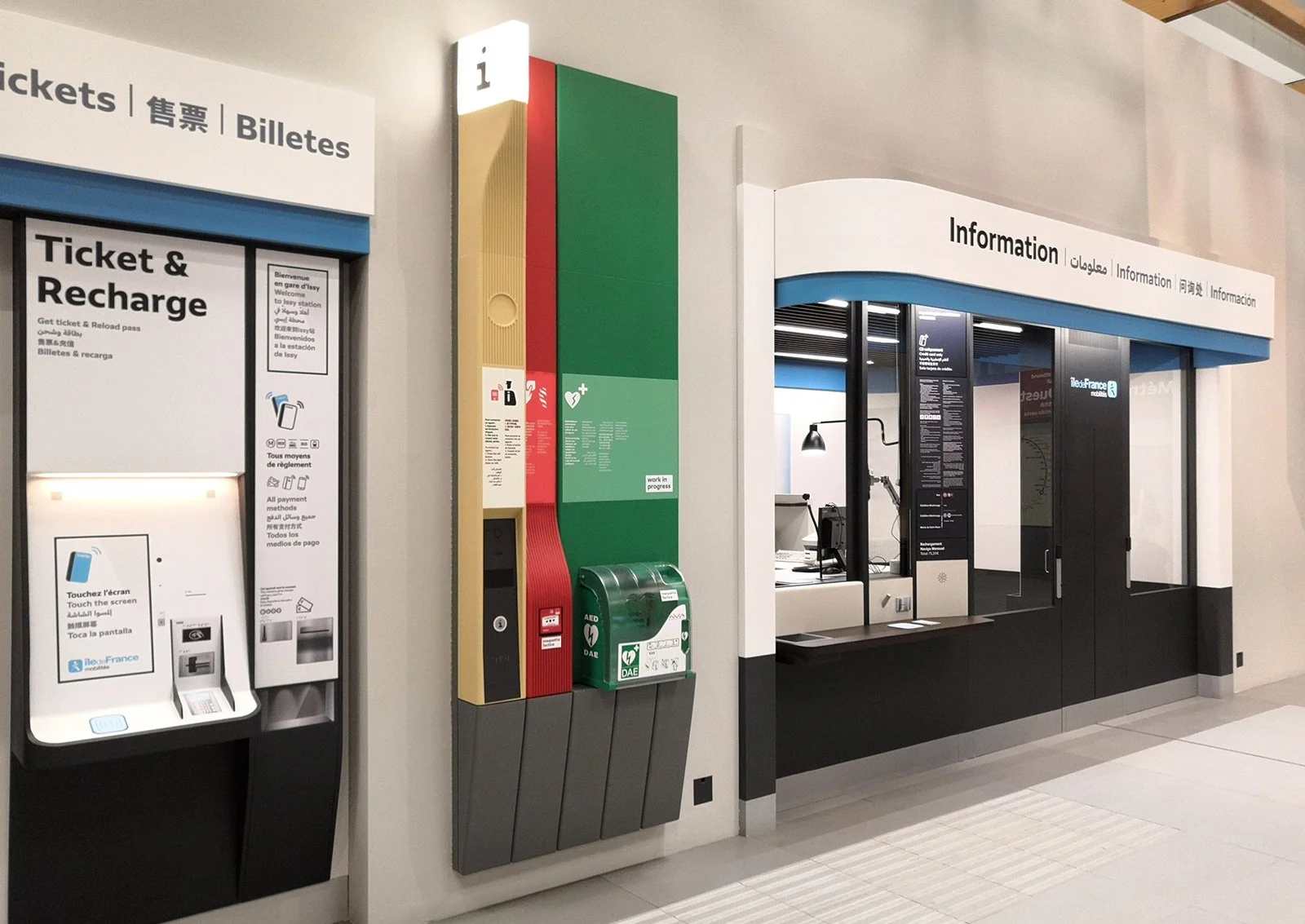In the case of the Grand Paris metro network, a color-coding system was used to distinguish incoming-flow panels (light backgrounds) from outgoing-flow panels (dark backgrounds).